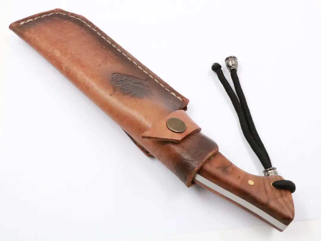 Zum Lieferumfang gehört eine handgefertigte Lederschutzhülle, die die Klinge schützt und das Schneidwerkzeug stilvoll transportierbar macht. Sie ergänzt das hochwertige Gesamtbild des Produkts.
