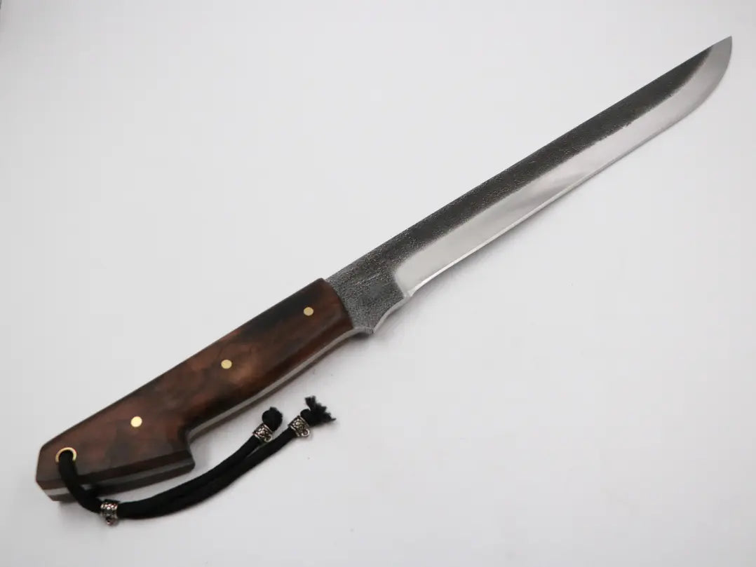With its elegant 370 mm long blade made of 50CRV4 carbon steel and a 160 mm walnut handle, this full tang knife combines aesthetics with functionality. The total length of 530 mm and the robust 6.2 mm thick blade make the Alif an ideal companion for demanding tasks. Protected in a high-quality leather sheath, this knife reflects the elegance of the Arabic letter Alif and is both a practical tool and an exquisite collector's item.