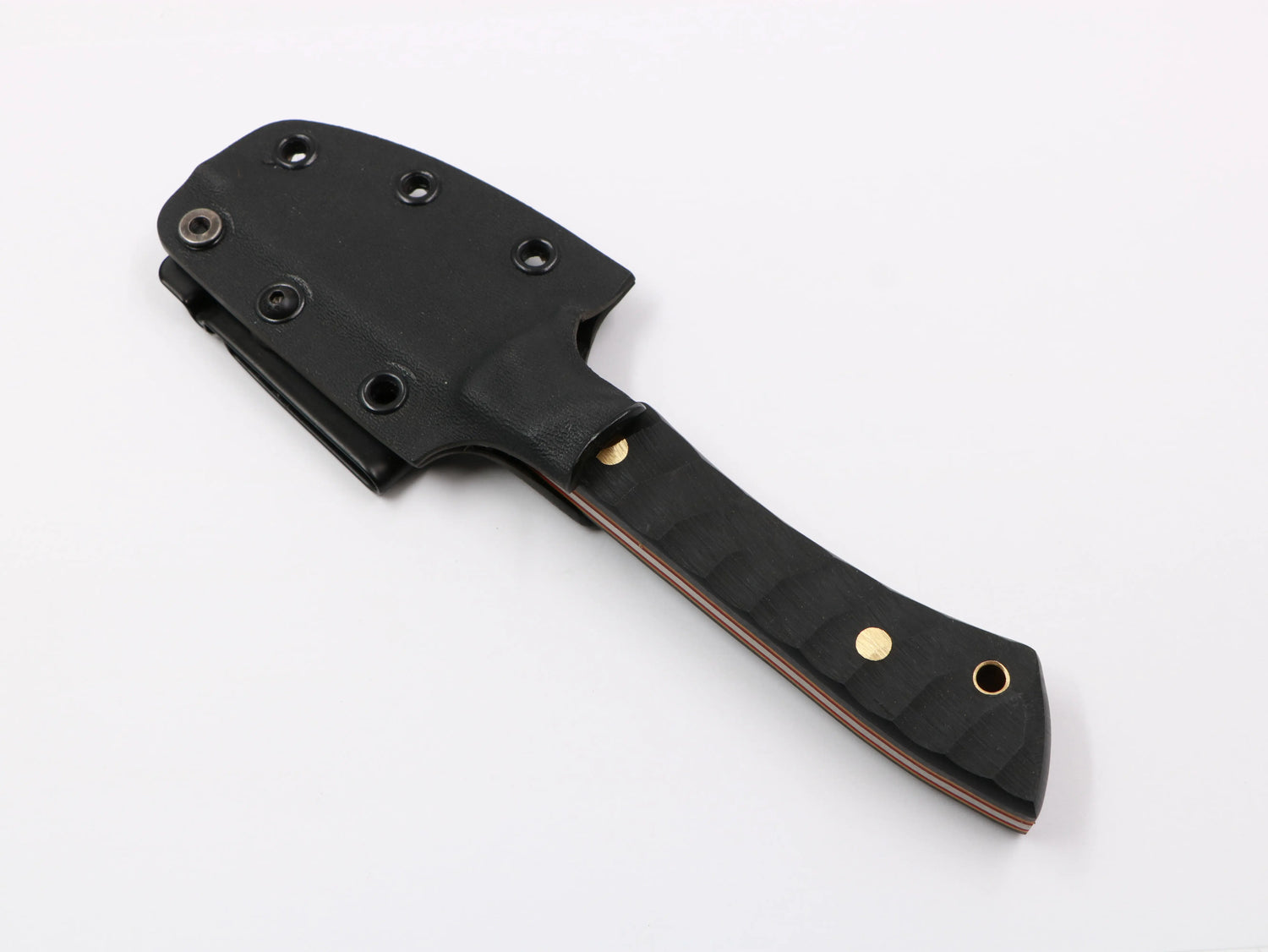 Das Messer wird in einer passgenauen Kydex-Scheide geliefert, die vielseitige Trageoptionen ermöglicht – ob am Gürtel, am Rucksack oder quer im Scout-Style.